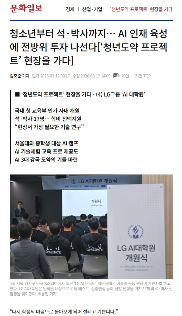 [ 보도자료] 청소년부터 석·박사까지… AI 인재 육성에 전방위 투자 나선다[‘청년도약 프로젝트’ 현장을 가다] 페이지 정보 작성자 월곡청소년센터 댓글 0건 조회 27회 작성일 26-03-14 17:42 목록 본문 자세한 내용은 하단의 링크를 클릭해 원문을 통해 확인해주세요 ^^보도자료 원문보기 ▶ https://www.munhwa.com/article/11573974?ref=naver 관련링크 https://www.munhwa.com/article/11573974?ref=naver 11회 연결 이전글[ 보도자료] “SNS 많이 쓰면 행복감 하락, 하루 1시간 이내로” 26.03.21 다음글[ 보도자료] 7월부터 전국 여성에 생리대 무상 보급... 저소득 청소년 넘어 전 연령층 확대 26.03.14 댓글 0 댓글목록 등록된 댓글이 없습니다.