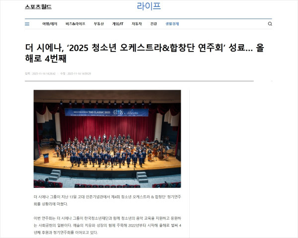 - 이전글[보도자료] 더 시에나 그룹, '제4회 청소년 오케스트라 & 합창단' 정기연주회 성료 25.11.15