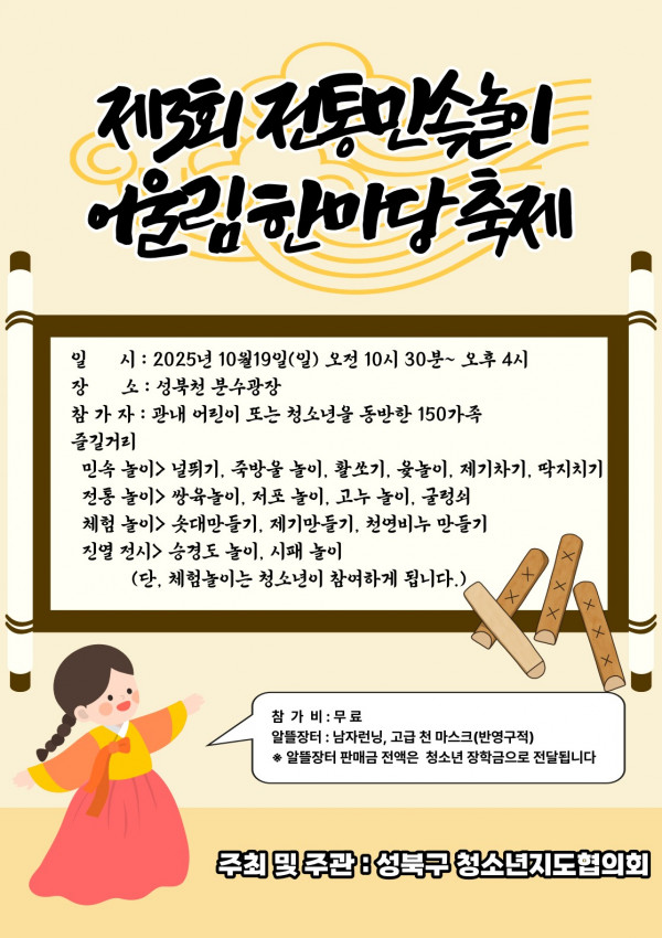 성북구 청소년지도협의회에서 주관하는 [제3회 전통민속놀이 어울림 한마당 축제]가 성북천 분수광장에서 진행된다고 합니다!