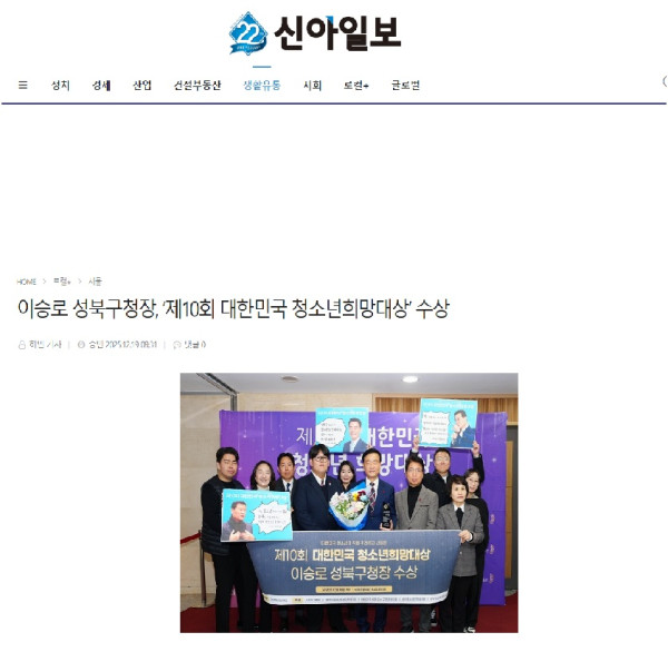 [보도자료] 이승로 성북구청장, ‘제10회 대한민국 청소년희망대상’ 수상