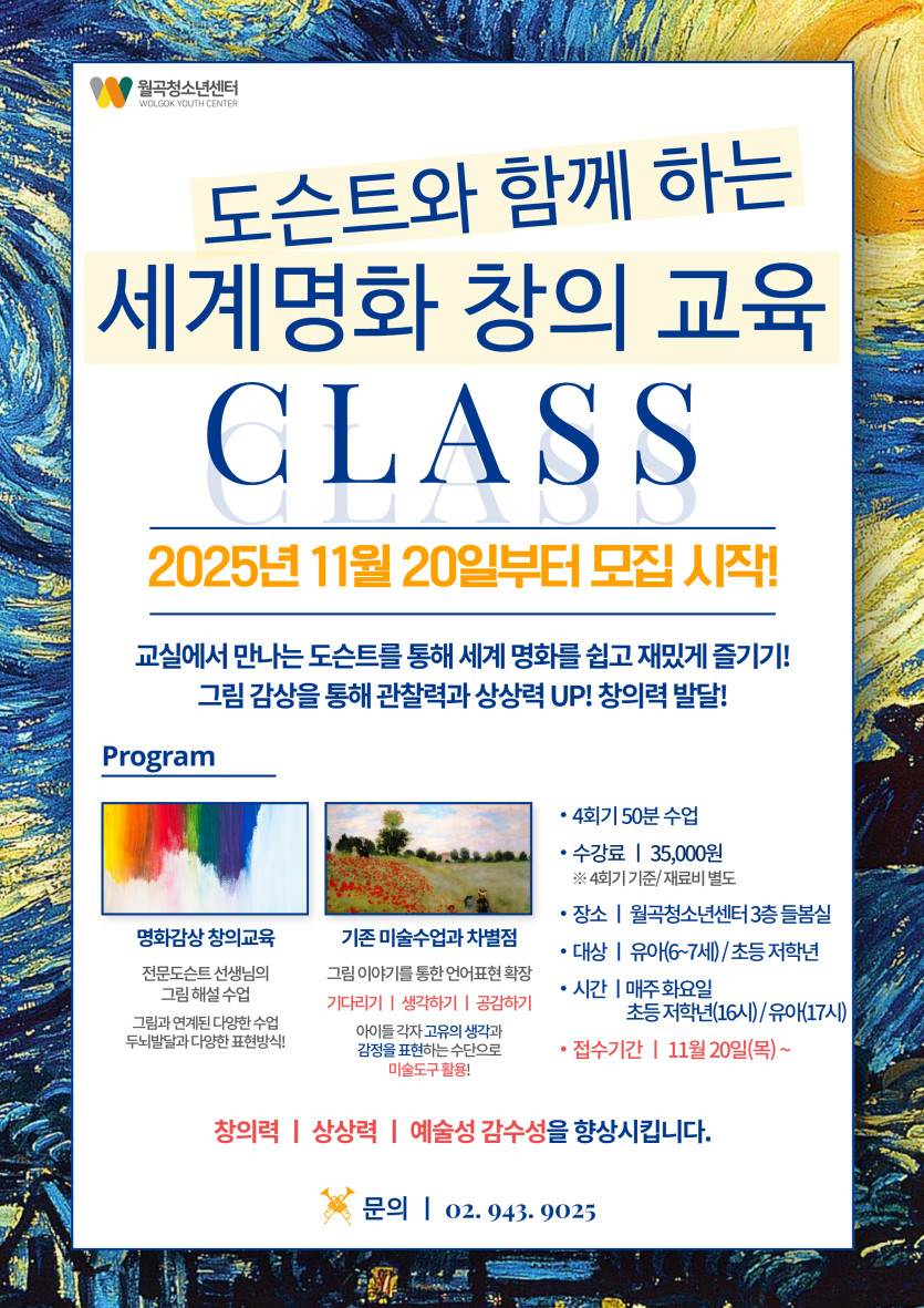 - 다음글[교육문화 월곡 Go] 창의력발달미술 :: 도슨트와 함께 하는 세계 명화 창의 교육 안내! 25.11.15