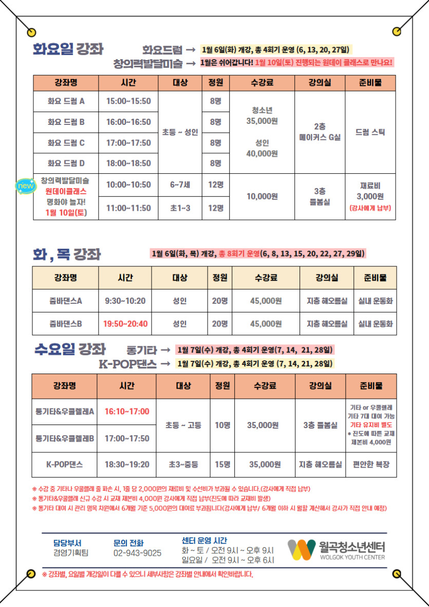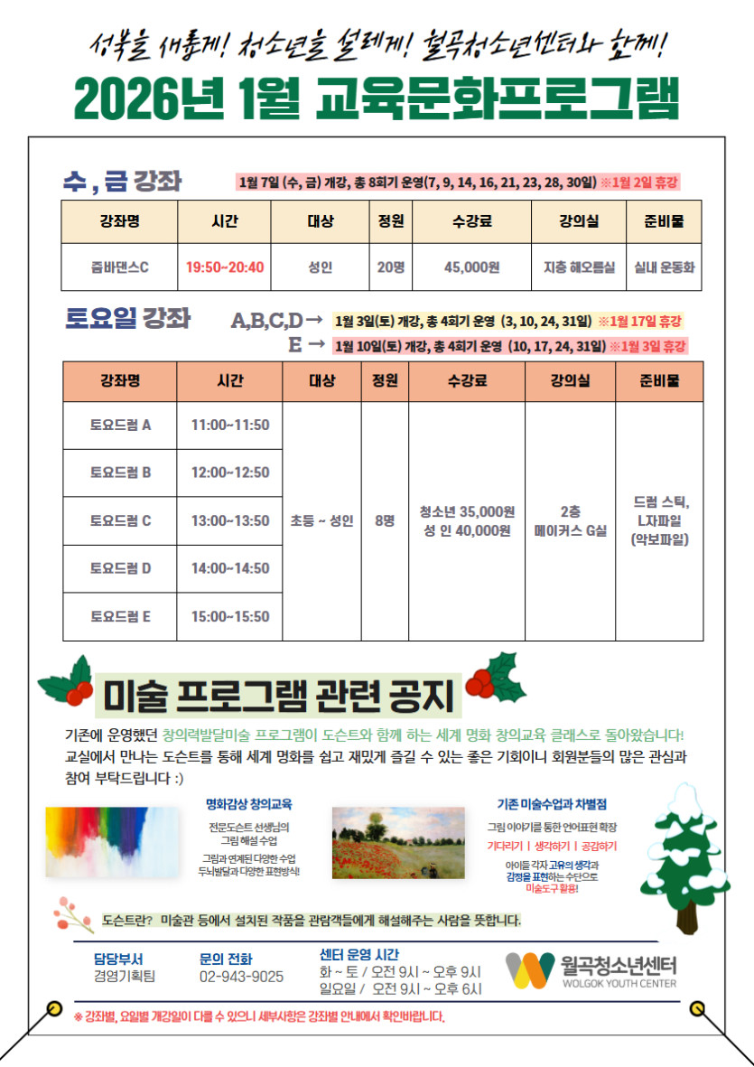 다채롭게 구성된 문화예술 프로그램을 월곡청소년센터에서 만나보세요!